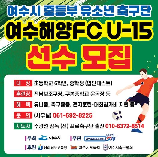 내고향뉴스 고광만 기자 | 여수시는 중등부 유소년 축구단 ‘여수해양FC U-15’ 창단을 위해 9월부터 신규단원을 모집한다고 밝혔다.