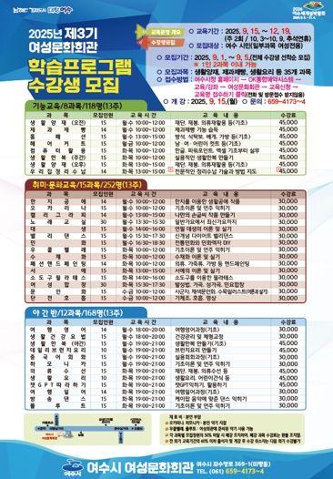 이번 교육은 9월 15일부터 12월 19일까지 진행되며 여수시에 거주하는 시민이면 누구나 참여할 수 있다. 1인당 최대 2과목까지 신청할 수 있으며 접수는 ‘여수시 OK통합예약시스템’을 통해 가능하다.