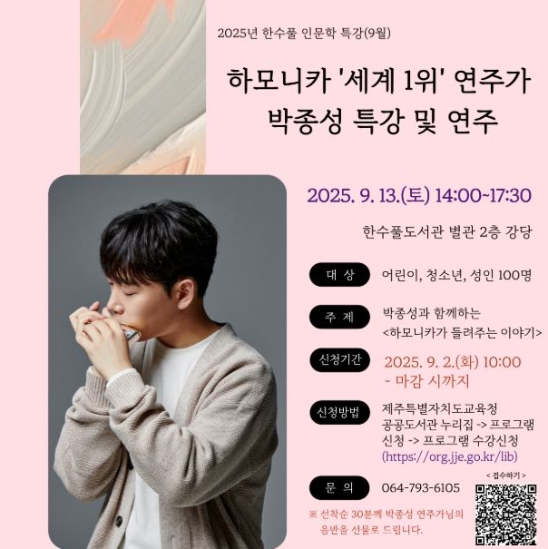 내고향뉴스 고광만 기자 | 제주도교육청 한수풀도서관은 오는 13일 오후 2시부터 5시 30분까지 별관 강당에서 인문학 특강 ‘하모니카가 들려주는 이야기’를 개최한다.