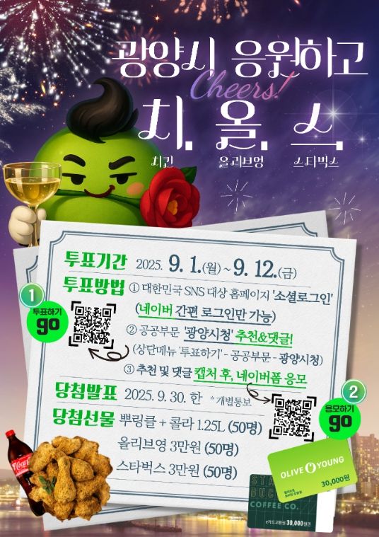 올해 투표 기간은 9월 1일부터 12일까지이며, 시는 누구나 쉽게 참여할 수 있는 온라인 이벤트 ‘광양시 응원(Cheer)하고 치. 올. 스.!(Cheers!)’로 참여율을 높일 계획이다.