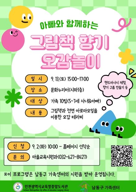 내고향뉴스 고광만 기자 | 천광역시교육청중앙도서관은 9월 13일 ‘아빠와 함께하는 그림책 향기 오감놀이’ 프로그램을 운영한다고 밝혔다.