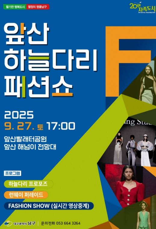내고향뉴스 고광만 기자 | 대구 남구는 오는 9월 27일 지역의 대표 관광명소인 앞산빨래터공원에서 하늘다리 패션쇼와 프러포즈 이벤트를 개최한다고 밝혔다.