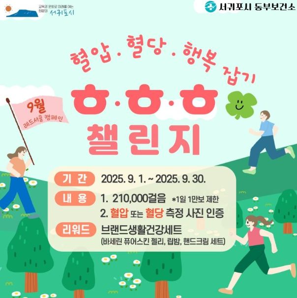 내고향뉴스 고광만 기자 | 서귀포시 동부보건소는 2025년 심뇌혈관질환 예방관리 주간을 맞이하여 '자기혈관 숫자알기, 레드서클 캠페인'의 일환으로 9월 한 달간 모바일 앱 ‘워크온’을 활용한 ‘ㅎˑㅎˑㅎ(혈압ˑ혈당ˑ행복) 잡기 걷기 챌린지’를 운영한다.
