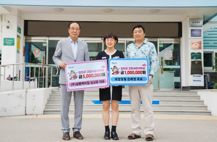 내고향뉴스 고광만 기자 | 합천군은 8월 29일 기획예산담당관실에서 ㈜삼광케미칼(부산광역시 소재) 심상윤 대표가 고향사랑기부금 500만원을, ㈜대양정밀(경남 김해시 소재) 강해영 대표가 고향사랑기부금 100만원을 각각 전달했다고 밝혔다.