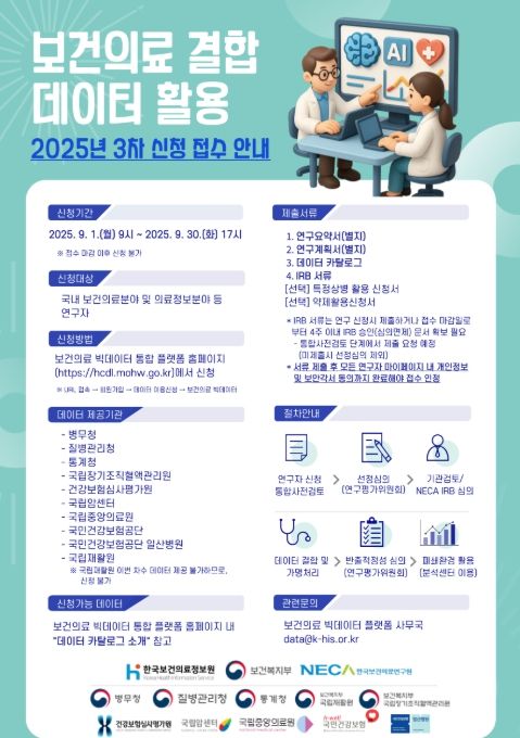 아울러, 한국보건의료정보원과 한국보건의료연구원은 9월 1일부터 9월 30일까지 보건의료 빅데이터 플랫폼을 통한 2025년 제3차 보건의료 결합 데이터 활용 신청을 접수한다. 연구자는 10개 기관이 제공하는 72종 데이터셋(16,823개 항목) 중 연구 목적에 맞는 데이터를 신청하여 이용할 수 있다. 보건의료 빅데이터 플랫폼 누리집에서 상세한 데이터 목록을 확인하고 신청할 수 있다. 데이터는 가명처리 절차를 거쳐 안전하게 활용된다.