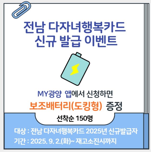 이번 이벤트는 2025년 전남 다자녀행복카드를 새로 발급받은 가정을 대상으로 하며, 9월 2일부터 MY광양 앱을 통해 참여한 선착순 150명에게 보조배터리를 증정한다.