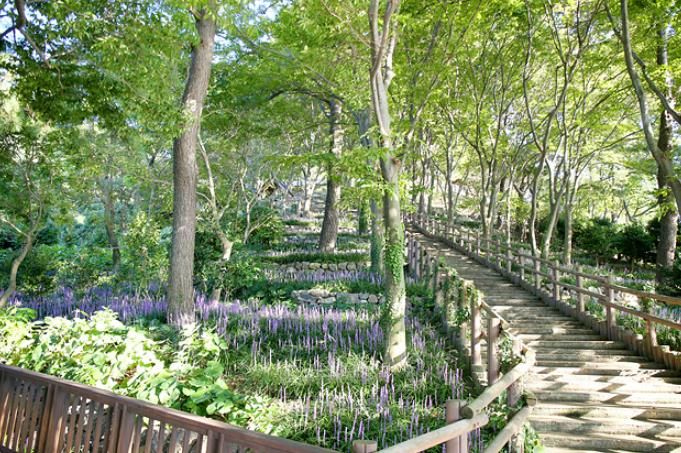 절벽의 단차를 따라 계단식으로 식재한 맥문동이 마치 보랏빛 폭포처럼 흐르며, 뒤이어 수국과 어우러져 그림 같은 풍경을 자아낸다.