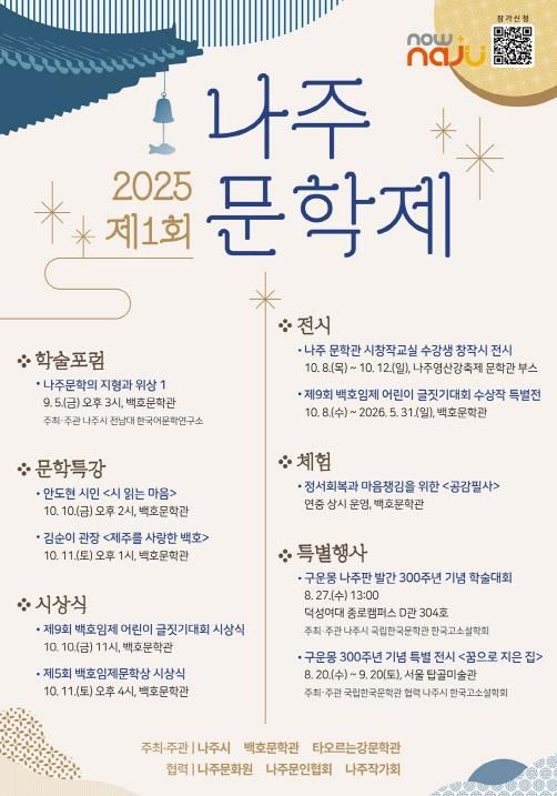 내고향뉴스 고광만 기자 | 전라남도 나주시가 문학 진흥과 관광 활성화를 위해 오는 9월부터 10월까지 제1회 나주문학제를 개최하고 학술포럼과 특강, 문학상 시상식, 전시 등 다채로운 프로그램으로 나주문학의 위상과 가치를 널리 알린다.