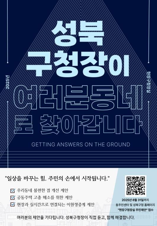 정책 홍보 방식도 한층 친근해진다. 성북구는 주요 구정 정책을 주민이 쉽게 이해할 수 있도록 ‘구청장과 함께하는 1:300 정책홍보 퀴즈’를 진행한다. 퀴즈를 풀며 정책 내용을 자연스럽게 익히는 방식으로, 단순 홍보를 넘어 재미와 학습을 결합한 주민 참여형 프로그램이 될 전망이다.