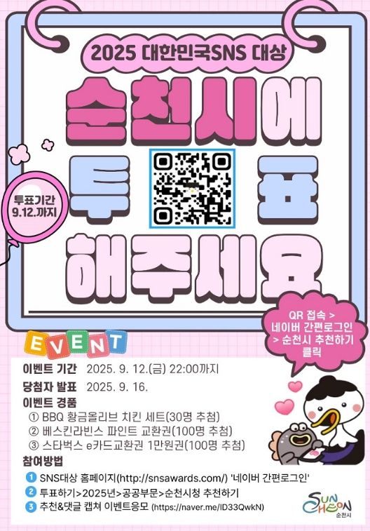내고향뉴스 고광만 기자 | 순천시는 ‘2025 대한민국 SNS 대상’ 공공부문 수상을 목표로 오는 12일까지 전 국민을 대상으로 투표 이벤트를 진행한다고 밝혔다.