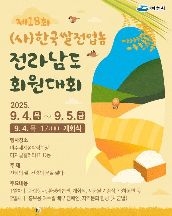 내고향뉴스 고광만 기자 | 여수시는 (사)한국쌀전업농전라남도연합회(회장 신정옥)와 (사)한국쌀전업농여수시연합회가 주최·주관하는 ‘제18회 (사)한국쌀전업농 전라남도 회원대회’가 9월 4일부터 5일까지 이틀간 여수세계박람회장에서 개최된다고 밝혔다.