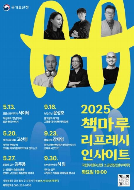 내고향뉴스 허민 기자 | 국가유산청은 9월 16일과 23일, 30일 오후 7시에 총 3회에 걸쳐 국립무형유산원 소공연장(전북 전주시)에서 '2025 하반기 ‘무형유산 책마루’ 인문학 강연'을 개최한다.