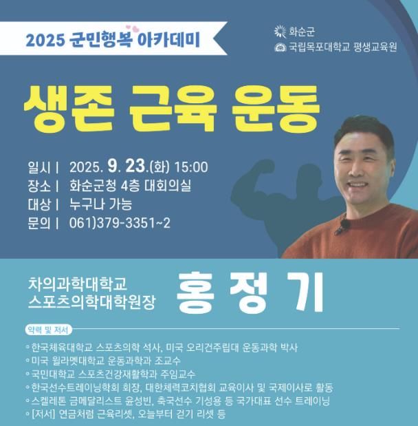 이번 강연에서는 단순한 운동법을 넘어 삶을 지탱하고 건강을 지키는 핵심 ‘생존 근육’의 중요성을 군민들에게 알리고, 누구나 쉽게 실천할 수 있는 운동 방법을 제시한다.