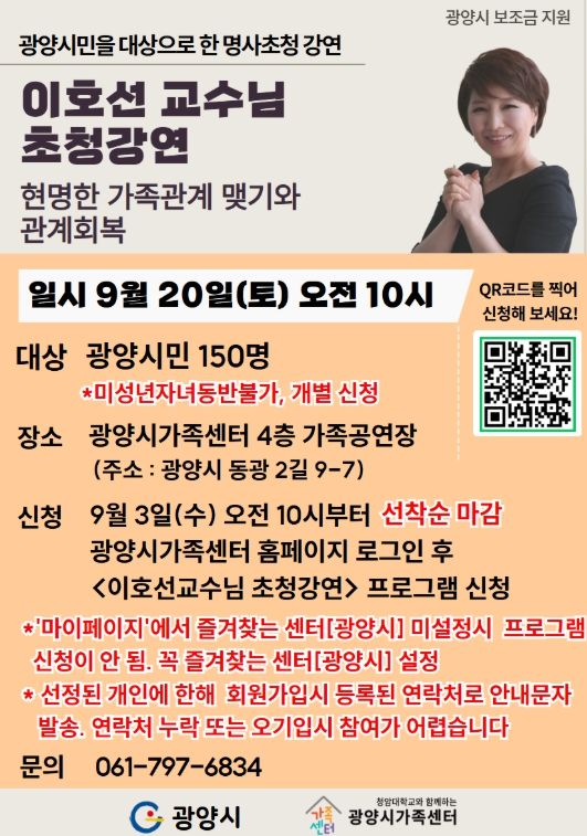 내고향뉴스 고광만 기자 | 광양시가족센터는 오는 9월 20일 센터 4층 가족공연장에서 광양시민을 대상으로 명사초청 강연을 개최한다고 밝혔다.