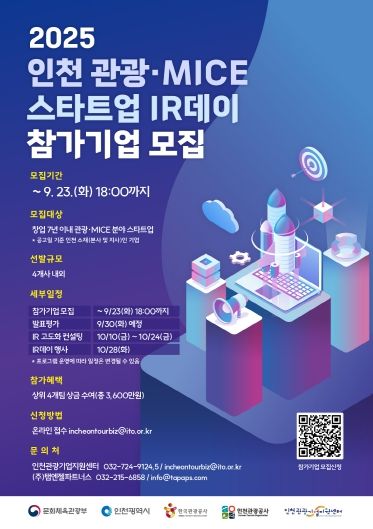 ‘2025 인천 관광 스타트업 IR 데이’의 참가 자격은 인천에 소재한 창업 7년 이내 관광·MICE 스타트업이며, 신청 접수는 9월 23일까지이다. 자세한 내용은 인천관광기업지원센터 누리집에서 확인할 수 있다.