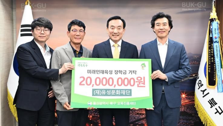 내고향뉴스 고광만 기자 | (재)유성문화재단이 2일 울산 북구교육진흥재단에 지역 인재 육성을 위한 장학금 2천만원을 전달했다.