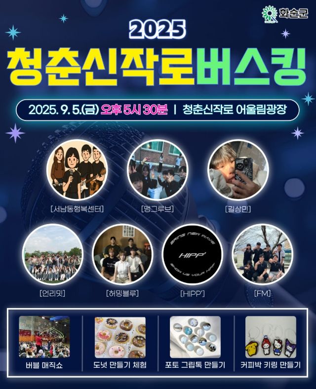 내고향뉴스 고광만 기자 | 화순군은 오는 9월 5일 금요일 오후 6시 청춘신작로 어울림광장에서 청년 아티스트들의 버스킹 공연을 개최한다고 밝혔다.