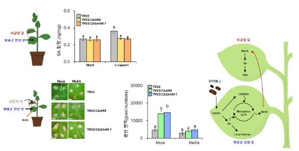 이후 CbAR9와 상호 작용하는 단백질 ‘CbSAHH’을 분리해 탄저병 저항성 기능을 검정했다. 그 결과 둘의 상호작용으로 병원균 침입 부위에서 이동성 면역 신호물질(메틸살리실산, MeSA)이 합성돼 다른 부위로 이동하는 것을 확인했다. 이를 통해 고추 식물체 전체가 저항성을 가지도록 유도해 고추 탄저병 면역 반응이 일어나는 것을 밝혔다.