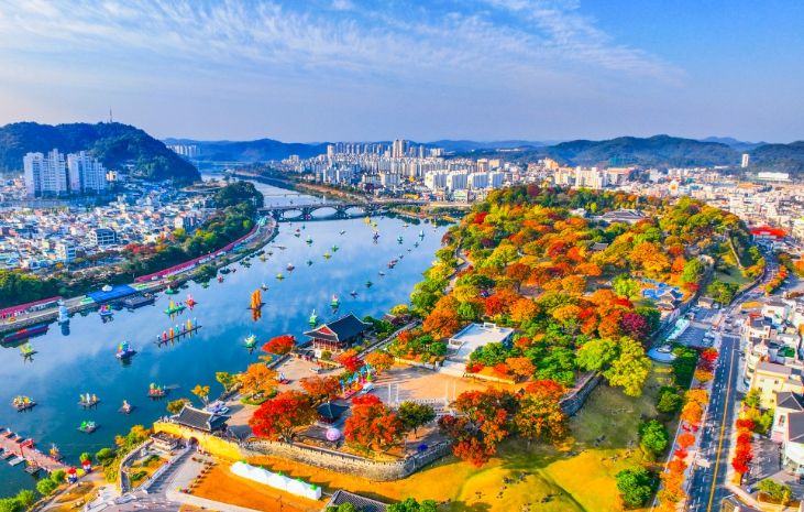 임진왜란 진주대첩의 전적지인 ‘진주성’은 우리나라의 호국정신과 진주의 찬란한 역사를 간직한 대표적인 문화유산이다. 가을 단풍이 성곽을 곱게 물들이면, 고즈넉한 역사와 화려한 자연 속에서 특별한 풍경을 만날 수 있다. 10월에 열리는 진주남강유등축제 기간에는 진주성과 남강이 아름다운 유등으로 화려하게 물들어, 밤에도 빼놓을 수 없는 진주의 가을 명소로 꼽힌다.