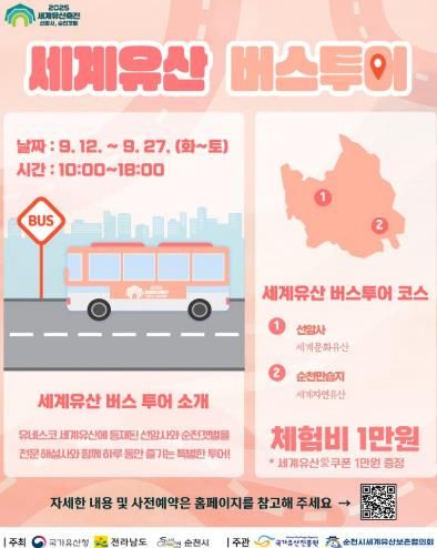 내고향뉴스 고광만 기자 | 순천시와 순천시 세계유산보존협의회는 오는 12일부터 27일까지 ‘2025 세계유산축전 선암사, 순천갯벌’ 버스투어 프로그램을 운영한다고 밝혔다.