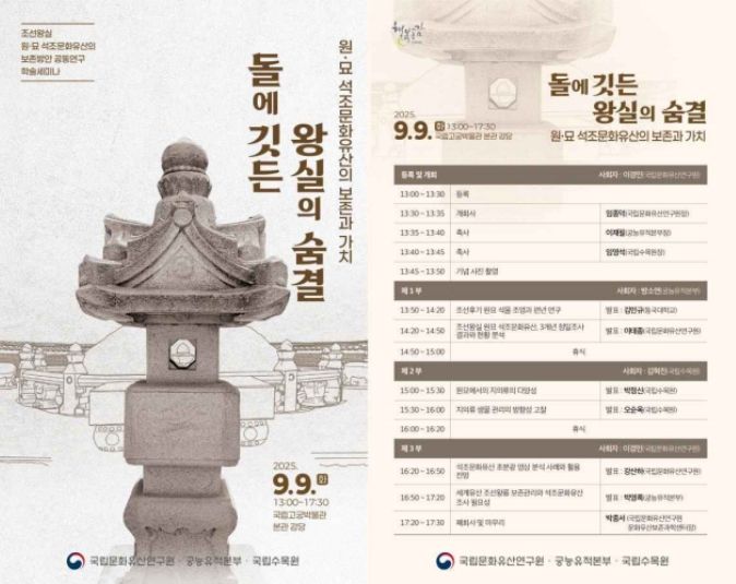 내고향뉴스 허민 기자 | 국가유산청 국립문화유산연구원과 궁능유적본부는 산림청 국립수목원과 함께 오는 9월 9일 오후 1시 국립고궁박물관 본관 강당(서울 종로구)에서 ‘돌에 깃든 왕실의 숨결, 원·묘 석조문화유산의 보존과 가치’를 주제로 학술발표회(세미나)를 공동 개최한다.