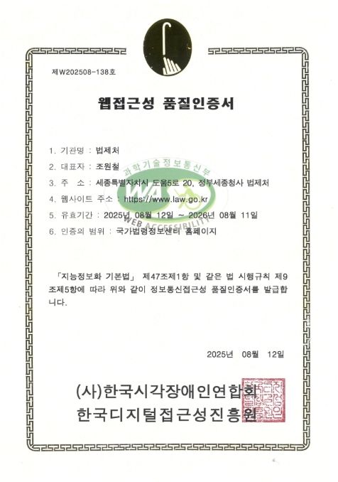 내고향뉴스 고광만 기자 | 법제처는 9월 3일, 국가법령정보센터가 2년 연속 웹과 모바일 앱 모두 접근성 품질인증을 획득했다고 밝혔다. 2024년에 처음으로 웹과 모바일 앱 모두 인증을 획득한 데 이어, 올해도 정보취약계층의 접근성이 우수하다는 점을 다시 한 번 확인받은 것이다.