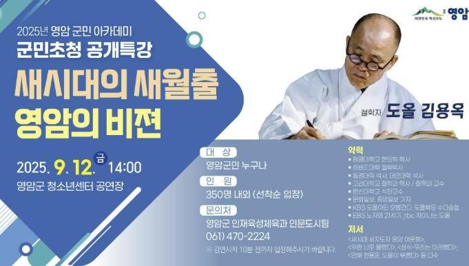 내고향뉴스 고광만 기자 | 영암군이 12일 오후 2시 영암군청소년센터에 도올 김용옥 선생을 초청해 ‘새시대의 새월출 영암의 비젼’을 주제로 영암군민아카데미 공개 특강을 개최한다.