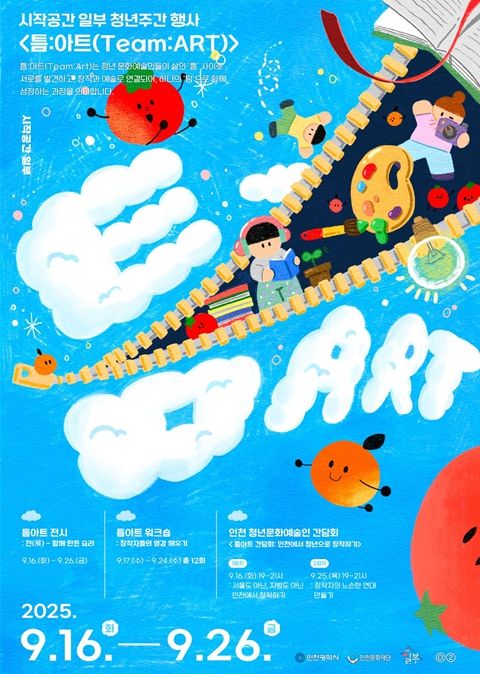 내고향뉴스 고광만 기자 | 인천광역시와 인천문화재단은 오는 9월 16일부터 26일까지, 인천청년문화창작소 ‘시작공간 일부’에서 2025 청년문화예술네트워크 구축사업의 일환으로 청년주간 행사 '틈:아트(Team:ART)'를 개최한다.