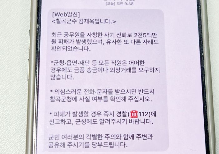 특히 칠곡군은 지난 6월에도 전국적으로 공무원 사칭 사기 피해가 잇따르자,“공무원은 ▲납품 유도 및 대금 대납 요구 ▲개인 계좌 입금 요청 ▲개인 번호·문자만으로 물품 구매 요청을 절대 하지 않는다”는 내용을 담은 주의 안내 문자를 군민들에게 발송하고, SNS와 마을방송을 통해 지속적으로 홍보해 왔다.