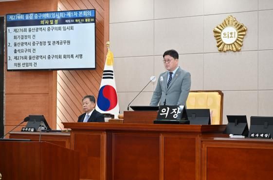 중구의회는 3일 본회의장에서 김영길 중구청장 등 관계 공무원이 참석한 가운데 제276회 중구의회 임시회 제1차 본회의를 개회했다.