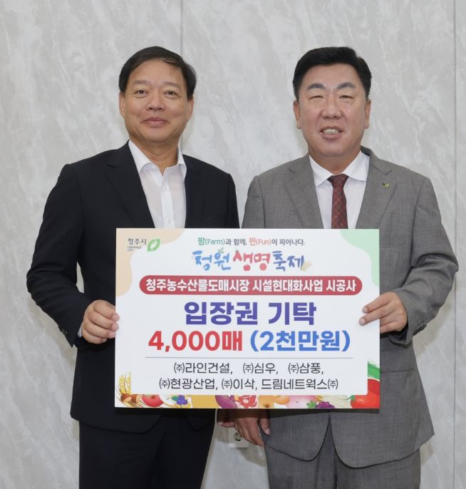 내고향뉴스 고광만 기자 | 청주시 농수산물 도매시장 시설현대화사업 시공사들은 3일 2025 청원생명축제의 성공 개최를 기원하며 청주시에 축제 입장권 4천매를 기탁했다.