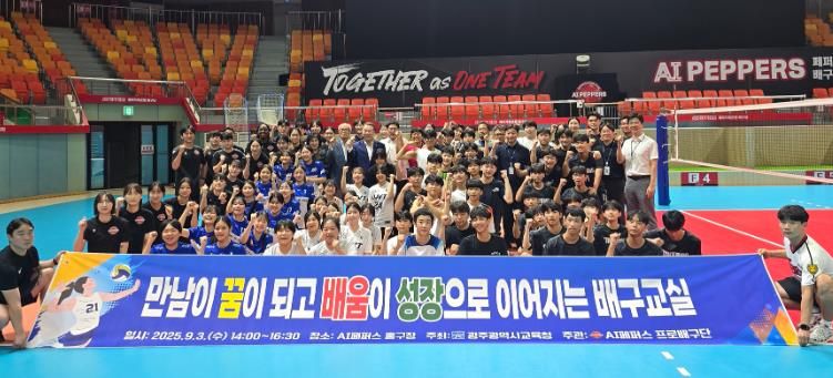 내고향뉴스 김형구 기자 | 광주시교육청과 페퍼저축은행 AI 페퍼스 배구단은 3일 페퍼 스타디움에서 ‘학교스포츠클럽 배구교실’을 운영했다.