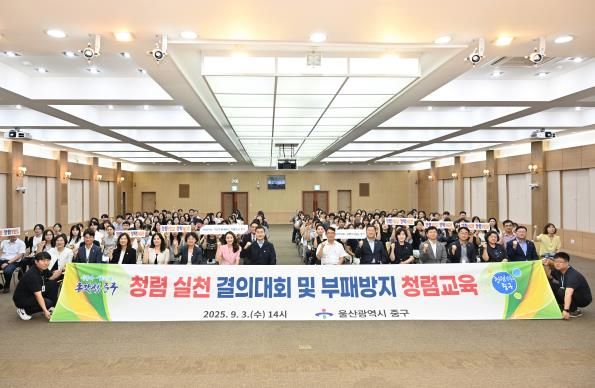 내고향뉴스 고광만 기자 | 울산 중구가 9월 3일 오후 2시 중구청 대회의실에서 ‘2025년 청렴 실천 결의대회 및 부패 방지 청렴교육’을 진행했다.