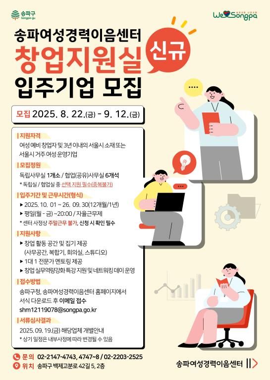 내고향뉴스 고광만 기자 | 서울 송파구가 올가을 송파여성경력이음센터 창업지원실에 입주할 신규 여성(예비)사업체 7곳을 오는 12일까지 모집한다고 알렸다.