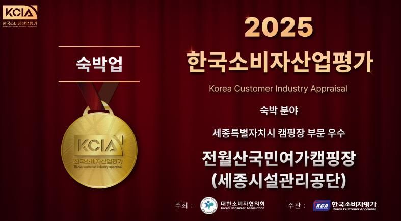 내고향뉴스 채필재 기자 | 세종특별자치시시설관리공단은 합강캠핑장과 전월산캠핑장이 대한소비자협회가 주최하고 한국소비자평가가 주관하는 ‘2025 KCIA 한국소비자산업평가-숙박업’ 부문에서 우수 숙박시설로 선정됐다고 밝혔다.