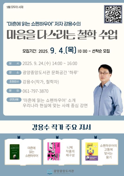 이번 강연에는 철학자이자 작가인 강용수가 초청돼 ‘마음을 다스리는 철학 수업’을 주제로 시민들과 만난다.