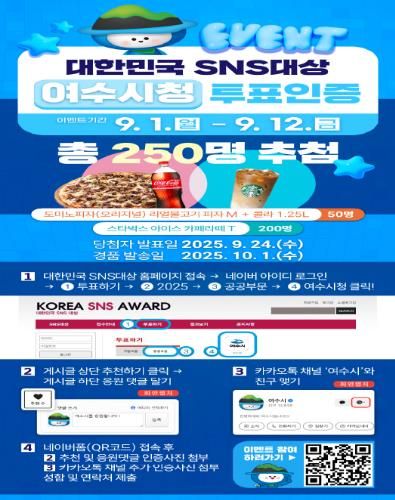 투표와 이벤트에는 누구나 참여할 수 있으며, 대한민국 SNS 대상 누리집에 접속해 네이버 아이디 로그인 후 ‘여수시청’에 투표하면 된다.