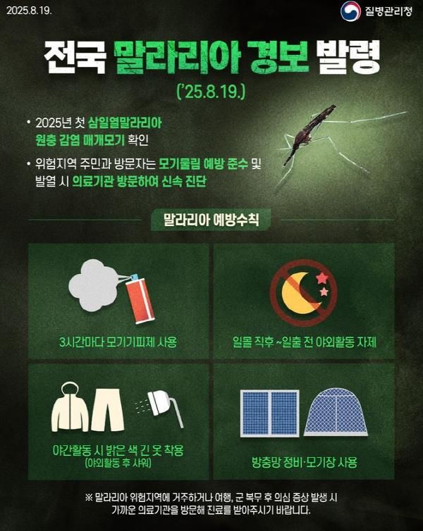 경보는 채집된 모기에서 말라리아 원충이 검출될 경우 전국 단위로 확대되며, 올해는 31주차(7월 28일~8월 3일) 강원도 양구군에서 채집된 얼룩날개모기류에서 국내 첫 삼일열 말라리아 원충 감염 모기가 확인되면서 발령됐다.