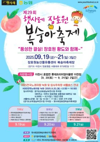 내고향뉴스 고광만 기자 | 이천시는 오는 9월 19일부터 21일까지 3일간, 장호원 햇사레 농산물 산지유통센터 복숭아축제장에서 ‘제29회 햇사레 장호원복숭아축제’를 개최한다. 올해 축제 주제는 “풍성한 결실! 장호원 황도와 함께~”이다.