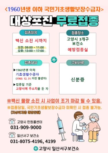 아울러, 고양시는 '고양시 대상포진 예방접종 지원에 관한 조례'에 따라 65세 이상 어르신 중 기초생활보장수급권자를 대상으로 대상포진 예방접종 비용을 1회 무료로 지원하고 있다.