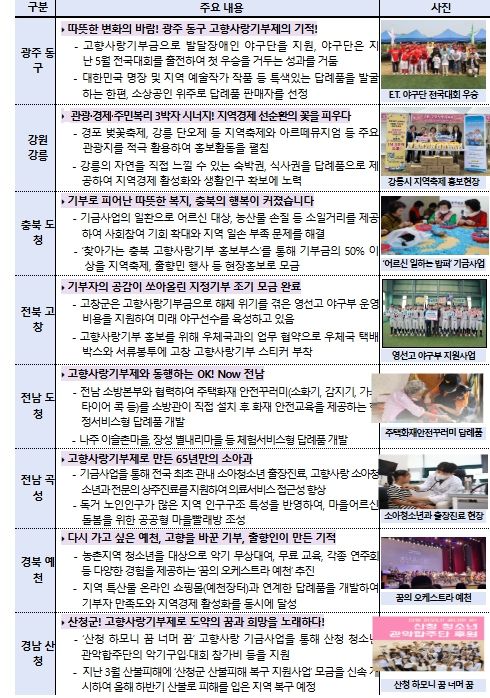 강원 강릉시는 경포 벚꽃축제, 강릉 단오제 등 지역 관광자원을 활용한 홍보전략이 두드러졌다. 충북은 ‘찾아가는 고향사랑기부 홍보부스’를 운영, 현장 홍보로만 기부액의 50% 이상을 모금했다.