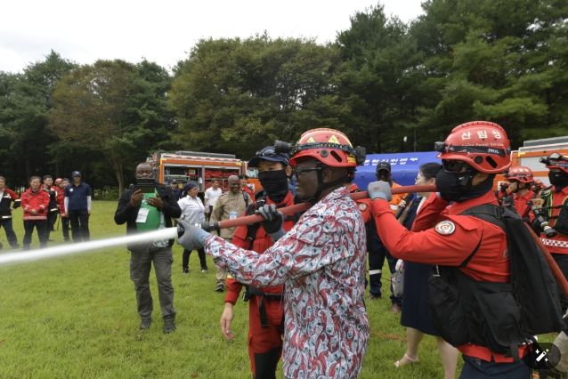 내고향뉴스 고광만 기자 | 산림청 중부지방산림청은 지난 2일 세종 금남면 일대에서 콩고민주공화국 산림관련 공무원과 민간 전문가 등을 대상으로 실제 상황을 방불케 하는 현장감 있는 산불진화전술을 선보였다고 밝혔다.