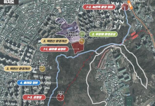 ‘백련산 꿈마을 숲정이 조성사업’은 백련근린공원의 자연 자원인 단풍나무 숲과 암석 지대 등을 활용한 도시 숲 체험형 힐링 공간을 조성하는 사업이다. 서울특별시 꿈나무마을 초록꿈터 뒤 백련근린공원 일대로 대상 면적은 약 1만㎡이다.