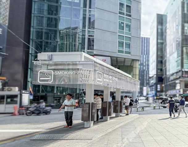 또 '개방형 제연 흡연시설'은 규제와 단속 위주의 기존 방식에서 나아가 흡연 혐오의 근본원인인 ‘연기와 냄새’ 문제를 해결하기 위해 기술과 디자인을 융합한 것이 특징이다. 흡연자 밀집 지역에 설치된 이 흡연시설은 에어커튼을 적용해 담배연기의 외부 확산을 차단하고, 특허 공법의 제연 정화장치 4대를 탑재해 정화한 공기를 배출한다. 여기에 자동 소화 기능의 대용량 재떨이를 설치해 흡연자의 편의와 환경 개선을 동시에 충족시켰다.