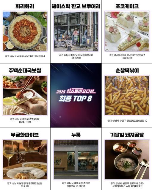 올해 선정된 점포는 △기달임 돼지곰탕(곰탕을 삶아내는 태도를 담은 공간, 분당구 판교역로) △포코케이크(감정을 전하는 레터링 케이크, 중원구 성남대로) △헤이스탁 판교 브루어리(포틀랜드·오레곤 스타일 브루어리, 분당구 판교공원로) △화리화리(MZ세대 취향을 반영한 주꾸미 전문점, 수정구 성남대로) △순창떡볶이(1988년 개업, 신흥종합시장의 첫 떡볶이집, 수정구 산성대로) △주백순대국보쌈(‘슬로우 푸드’ 철학으로 정성스럽게 끓인 순대국, 중원구 광명로) △무궁화파이브(신선한 재료를 활용한 브런치 메뉴, 분당구 동판교로) △누룩(전통주에 진심인 감성 한식주점, 지역 별미주까지 보유, 중원구 둔촌대로) 등 8곳이다.