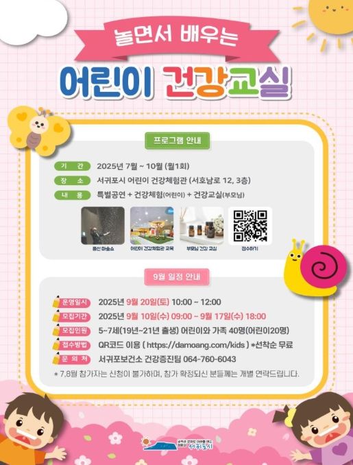 내고향뉴스 고광만 기자 | 서귀포시는 9월 '어린이 건강교실' 참가 가족을 모집하고 9월 20일 토요일 어린이 건강체험관, 서귀포시 건강생활지원센터에서 운영한다.