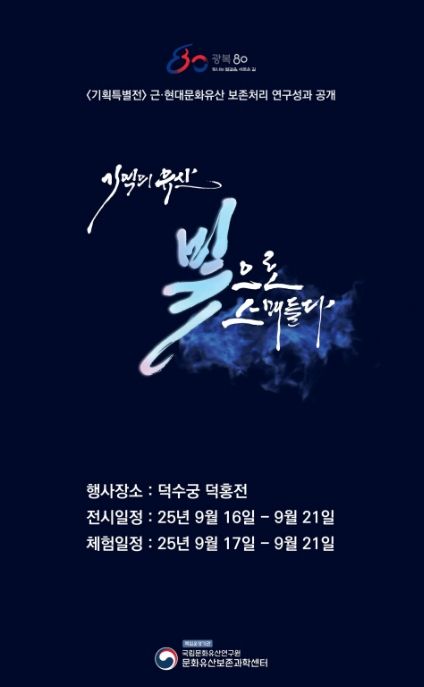 내고향뉴스 허민 기자 | 국가유산청 국립문화유산연구원 문화유산보존과학센터는 광복 80주년을 맞아 오는 9월 16일부터 21일까지 6일간 덕수궁 덕홍전(서울 중구)에서 광복과 독립운동의 상징적 유물이 보존처리를 통해 어떻게 되살아났는지 그 과정을 영상과 사진으로 조명한 기획전 '기억의 유산, 빛으로 스며들다'를 개최하고, 9월 16일 오후 2시에 개막식을 개최한다.