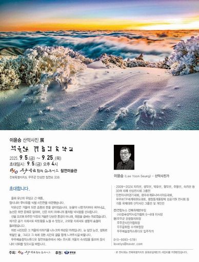 내고향뉴스 고광만 기자 | 무주 예술창작스튜디오 칠연미술관 입주 작가 전시회가 호응을 얻고 있다. 9월 25일까지는 ‘이윤승 작가의 산악사진 전시회, “덕유산 겨울의 속삭임”이 개최될 예정이다.