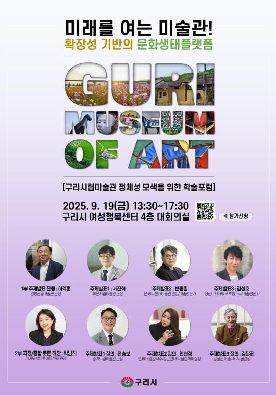 특히, 공립미술관, 미술기관, 학계 등 다양한 분야를 대표하는 기관장들이 한자리에 모여, 동시대 공립미술관의 사회적 역할, 지역 예술가 연구, 미래미술의 허브로서의 구리시립미술관에 대한 다각적 주제를 아우르는 심층 토론을 통해 구리시 문화예술의 미래 비전을 시민과 함께 모색하는 자리가 될 전망이다.