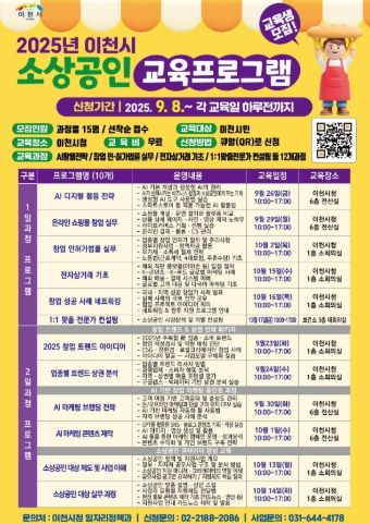 내고향뉴스 관리자 기자 | 이천시는 예비 창업자와 초기 소상공인을 대상으로 한 ‘2025년 하반기 소상공인 교육프로그램’ 교육생을 모집한다.